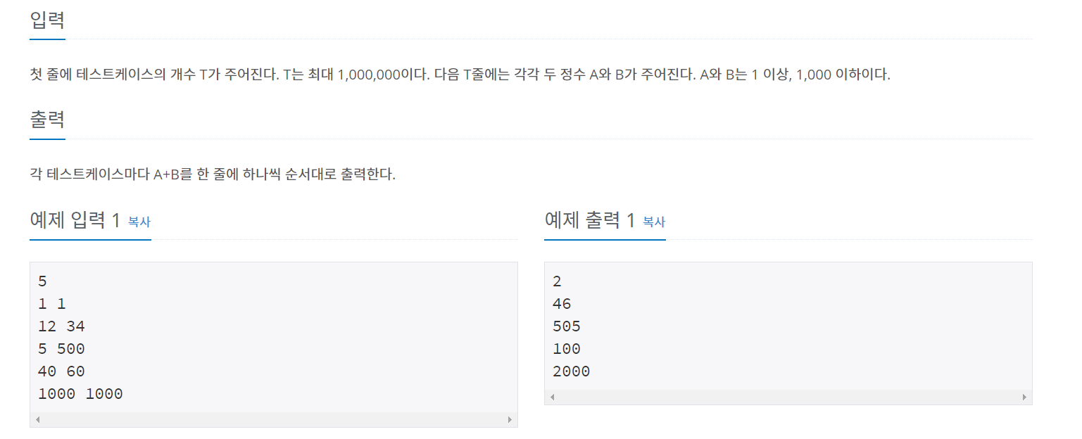 그리고 입력받은 숫자만큼 반복문을 실행해 A와 B값을 한번에 입력받았는데 그 것을 StringTokenizer를 통해 분리해주고 분리된 값들을 int타입으로 변환하고 더하여 result배열의 각 인덱스에 담고 BufferedWriter를 통해 출력하였다.