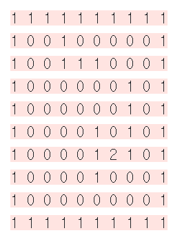 개미가 출발하는 좌표는<2,2>(배열 상으로는 <1,1>)로 주어졌으니 x좌표 : 1, y좌표 : 1로 설정한 후에 0을만나면 9로바꿔주고 y좌표를 1씩 증가시켰다. 그리고 1을 만나면 아래로 이동하기 위해 x는 1을 더해주고 y는1을빼주는 방식을 사용하였다.